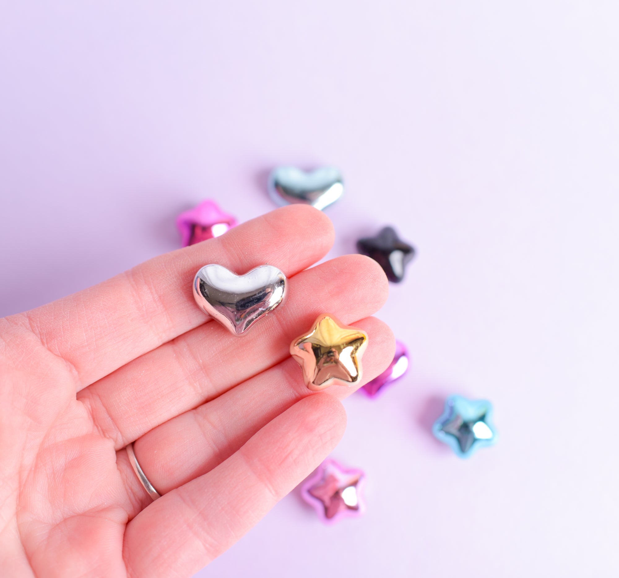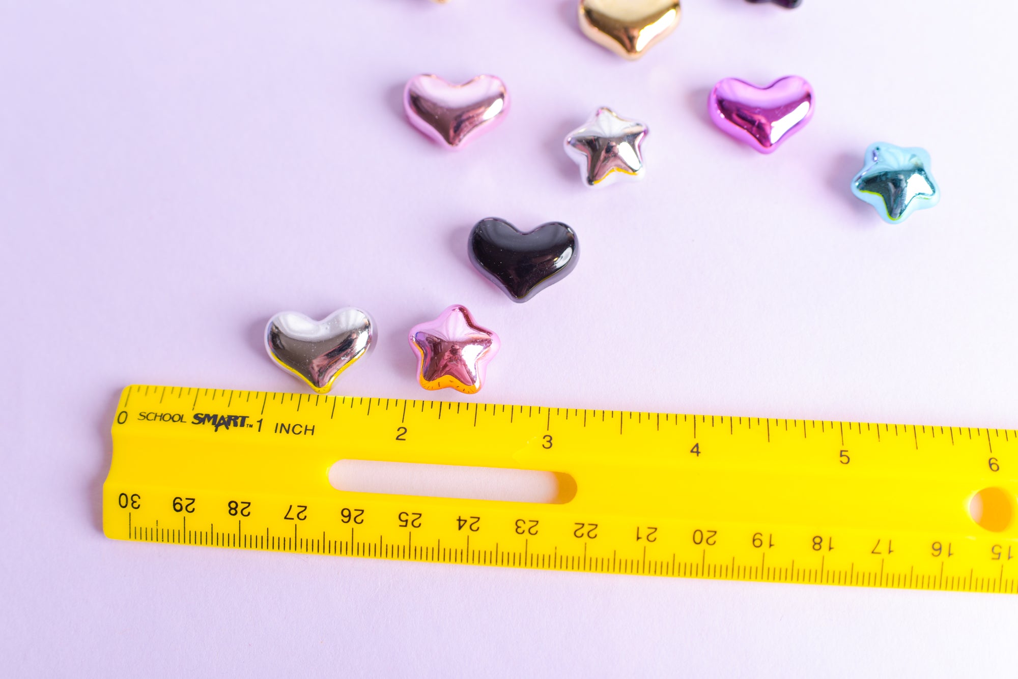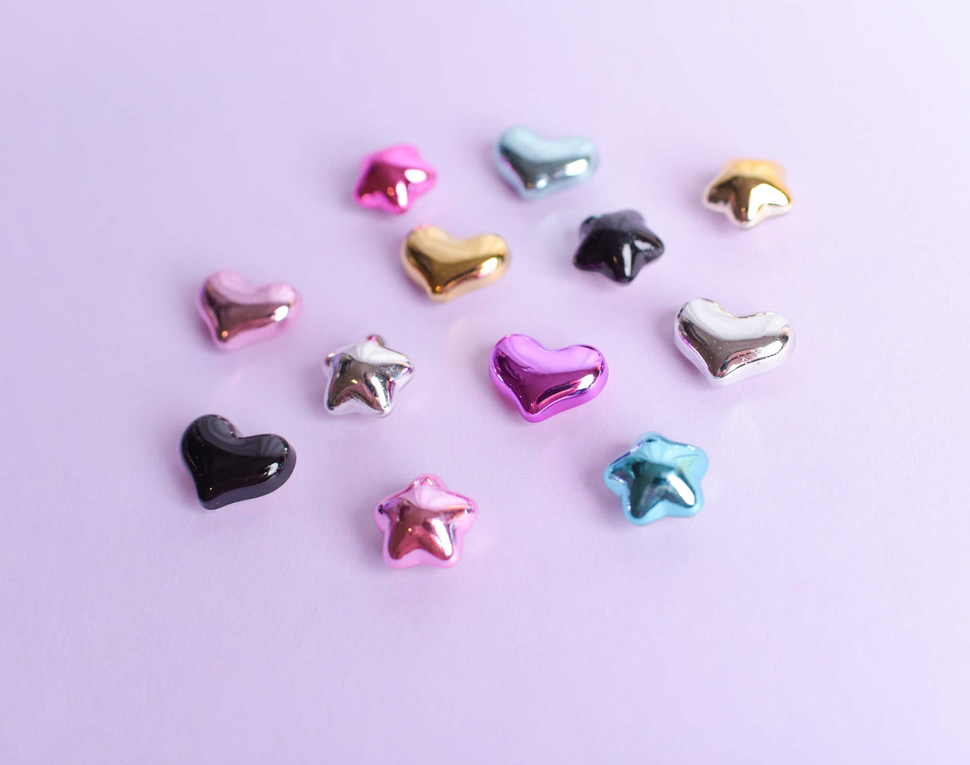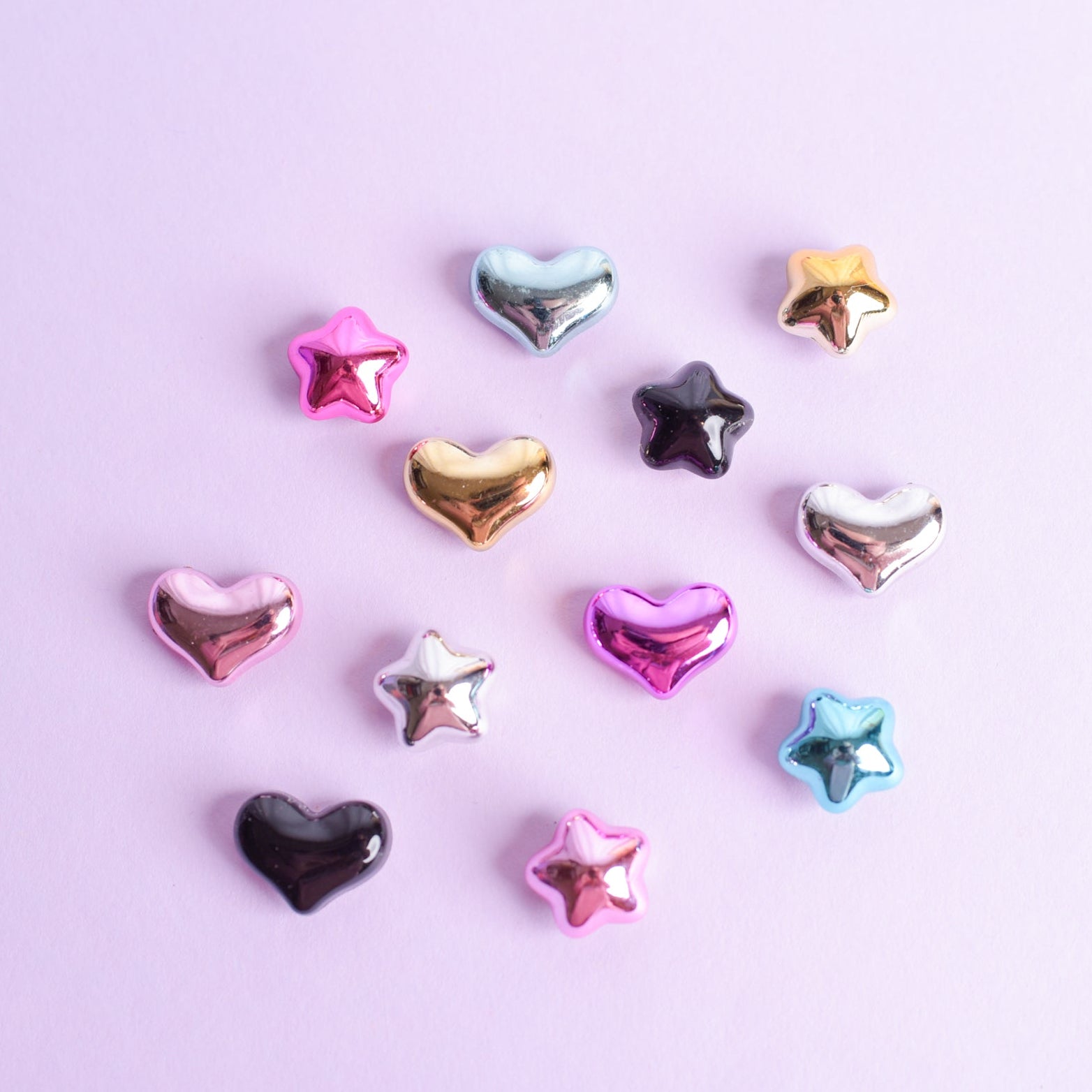 Little shiny bubble heart and star magnets in assorted metallic colors; assortments may vary slightly in color and shape. Set will include 12 magnets. Resin charms are attached to tiny but strong neodymium magnets and measure around 1/2-3/4" in size. Please note that there may be a little scuff in the metallic surface; it's just how the charms are made but is barely noticeable due to the nature of the product. Perfect for a girl's locker, women's cubicle, or to add a little flair to your home refrigerator.