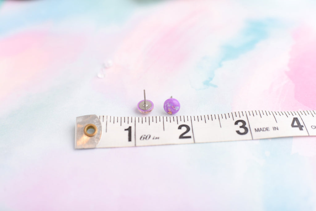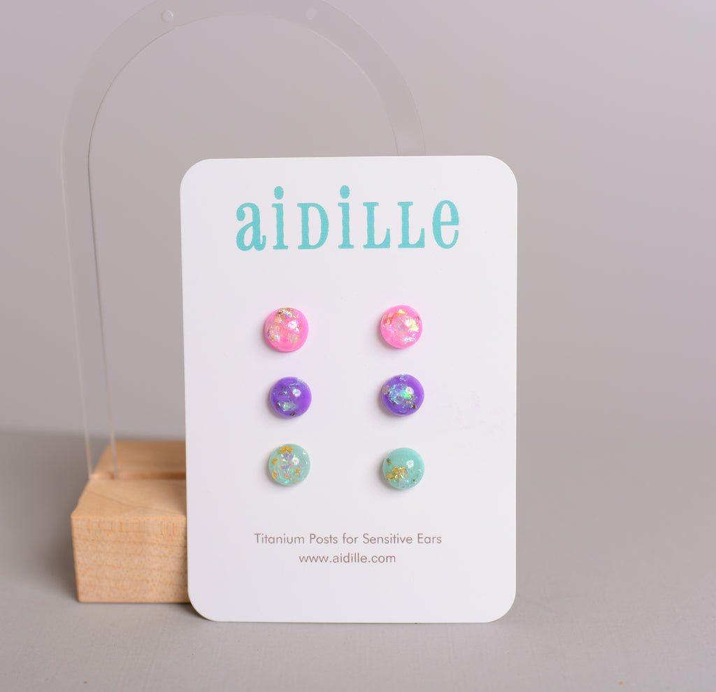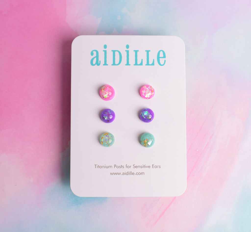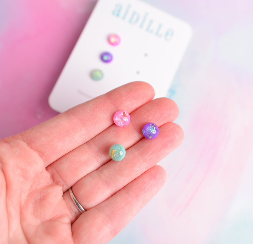 Gold leaf and iridescent flecked earring trio with 3 sets of mini resin circle earrings in pink, purple, and seafoam green