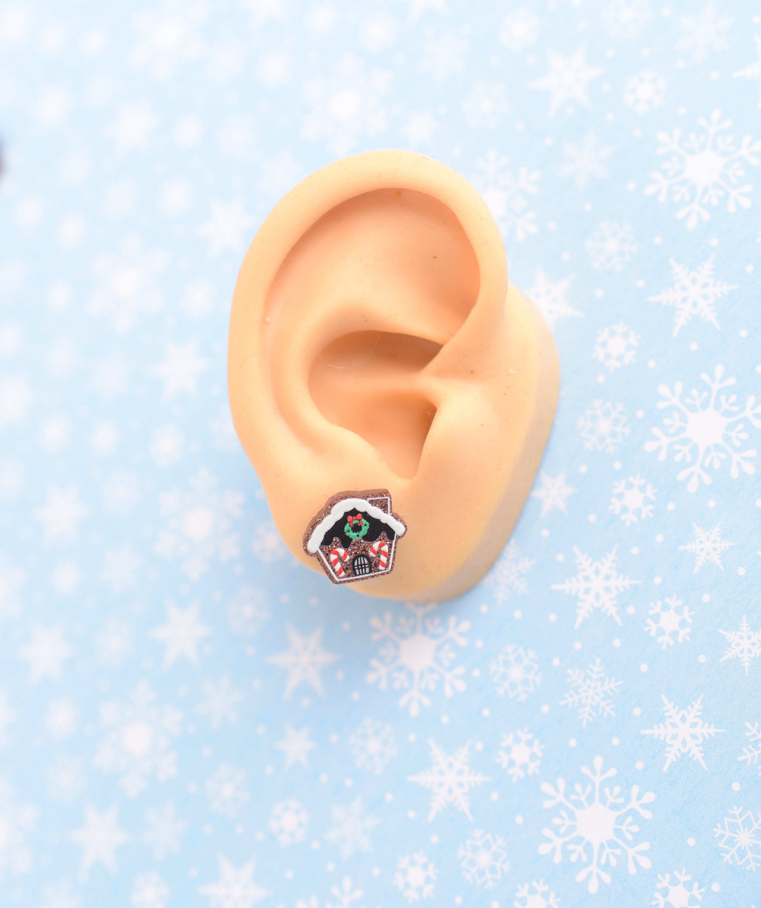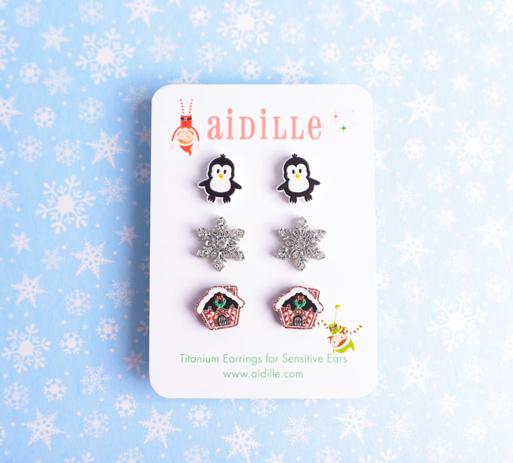 One pair each: Penguins, glitter silver snowflakes, glitter gingerbread houses