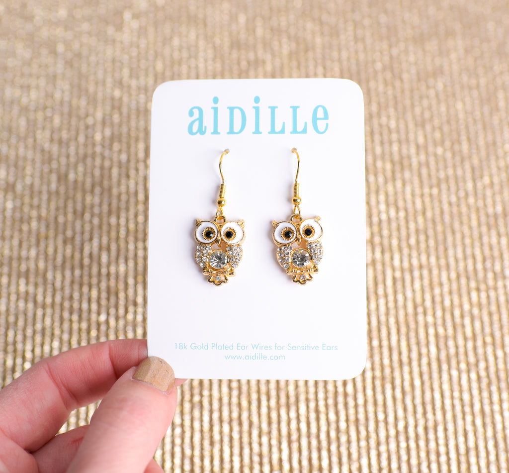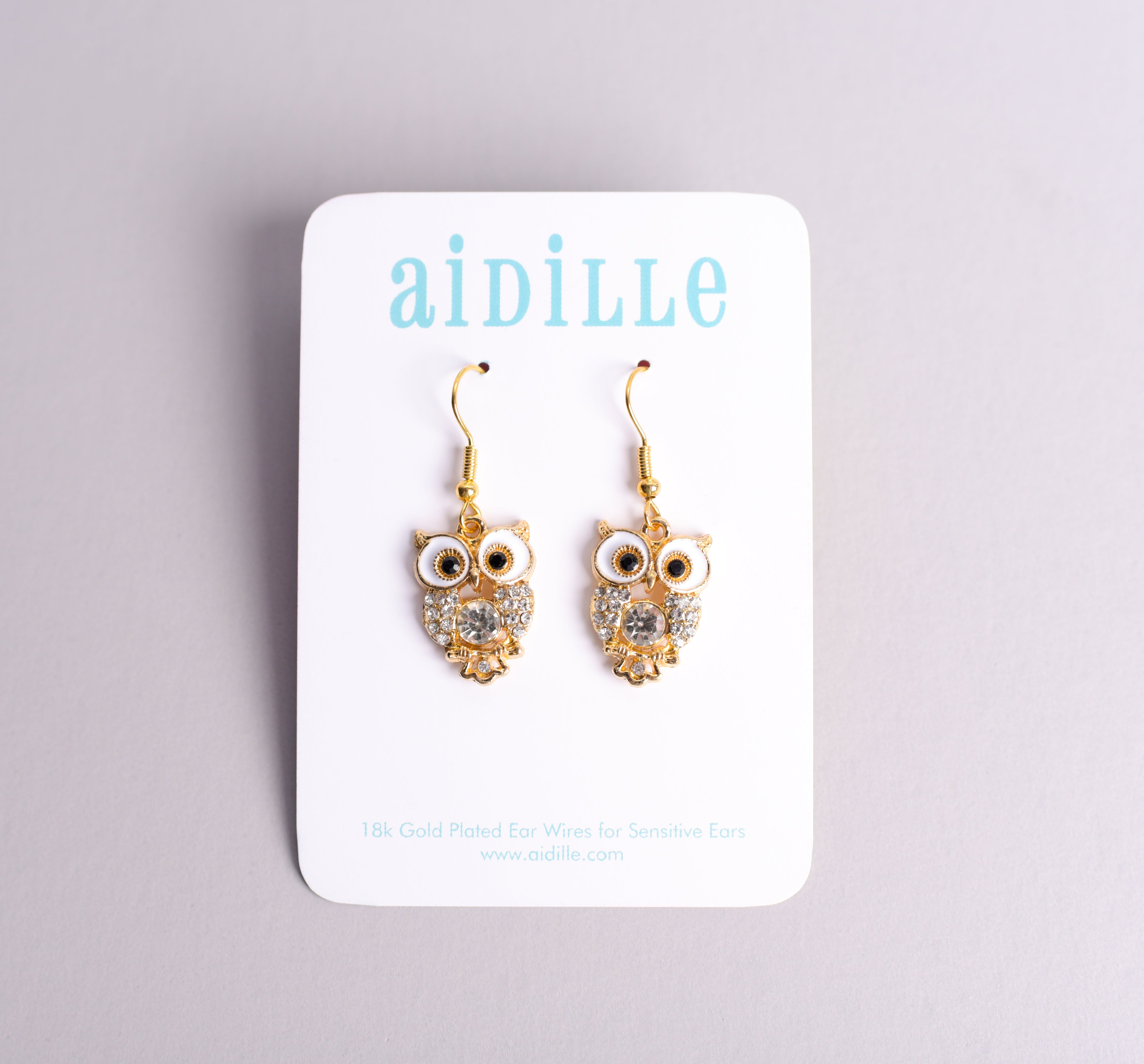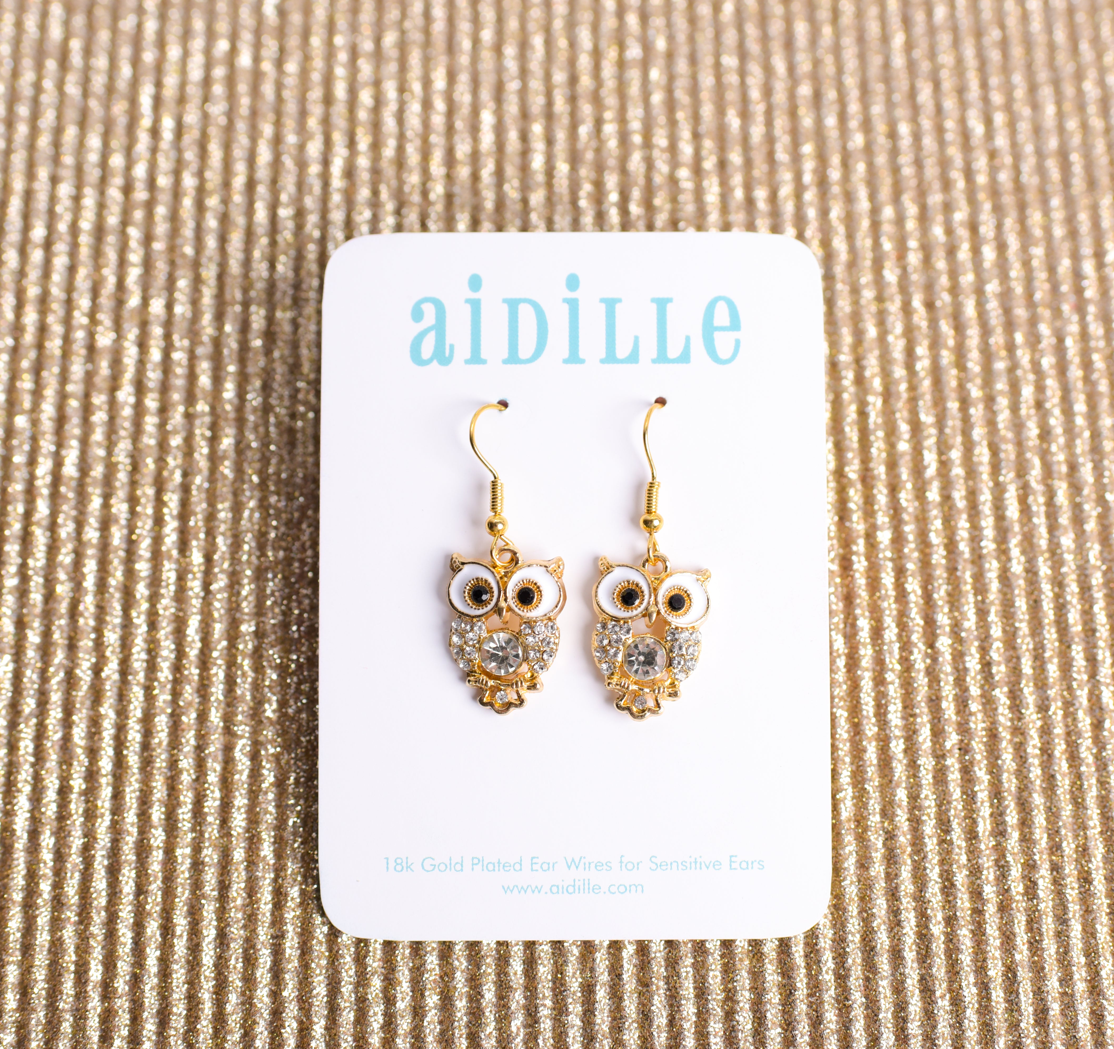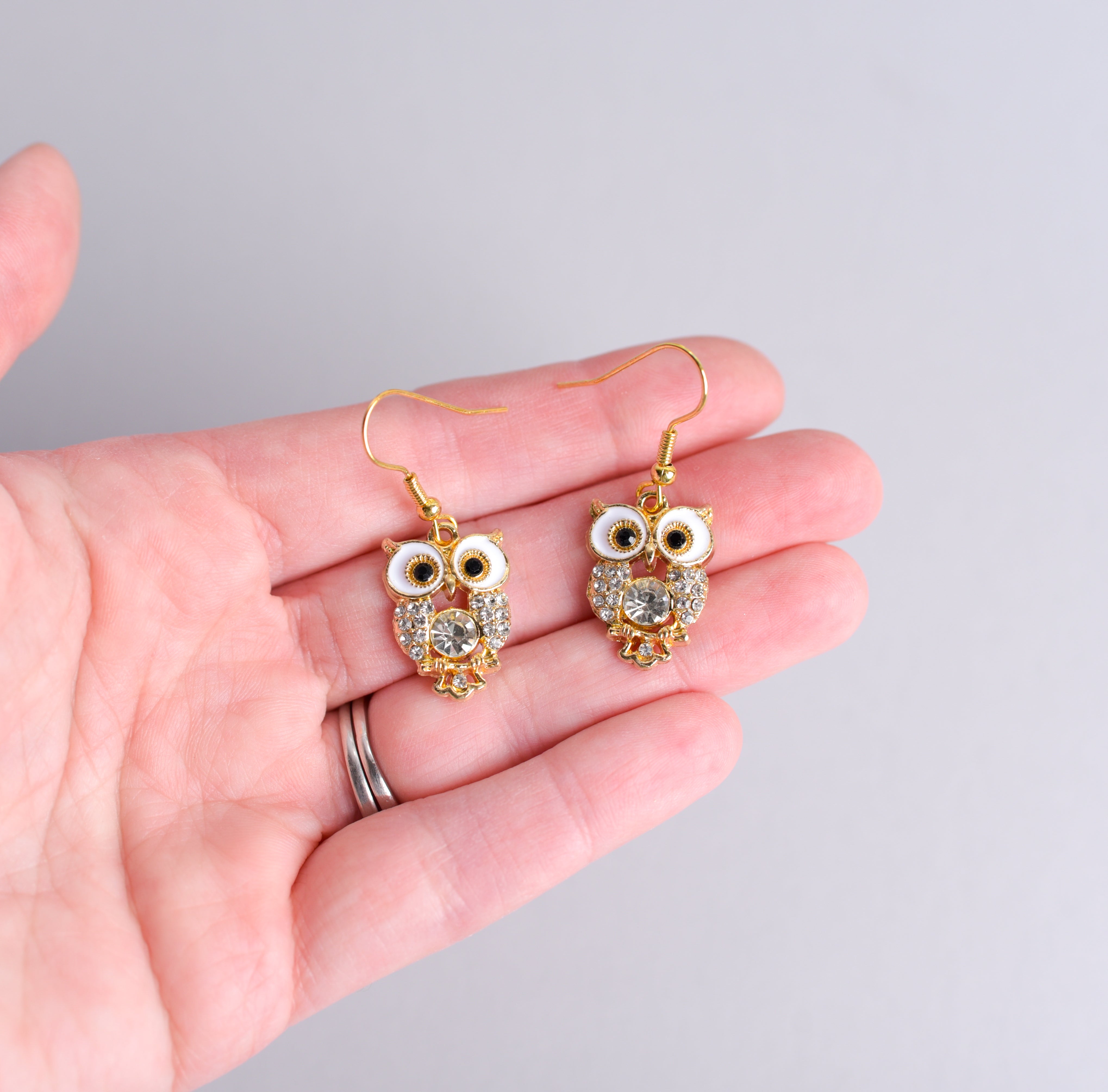 Sparkly gold colored owls with rhinestone sparkly detailed dangle earrings