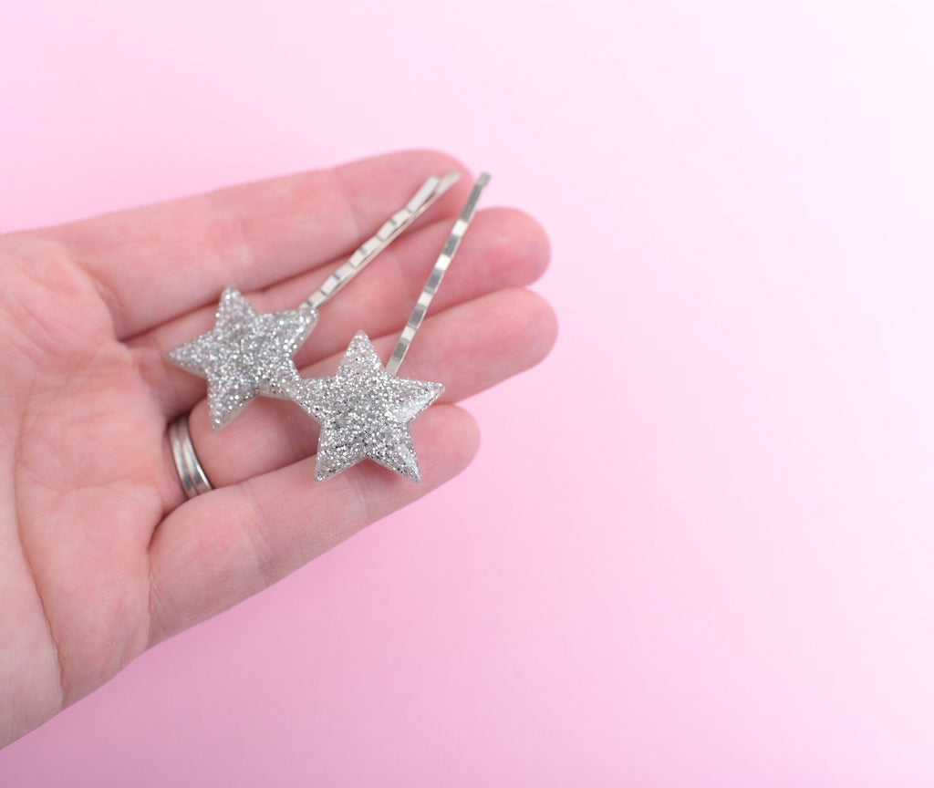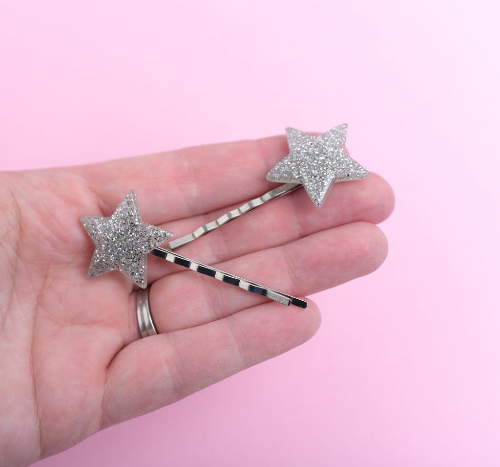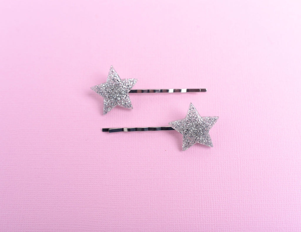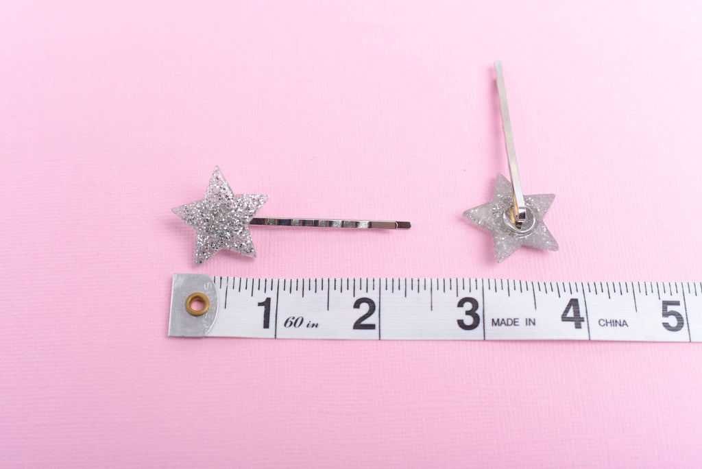 DETAILS:Set of 2 glitter star silver bobby pinsMeasure approx 2 1/4" wideBobby pins have a tight hold