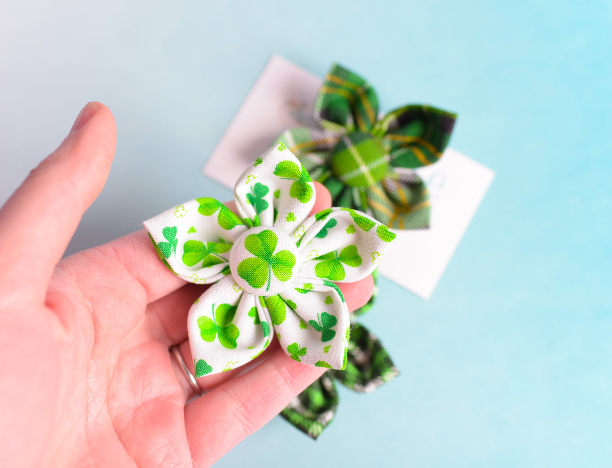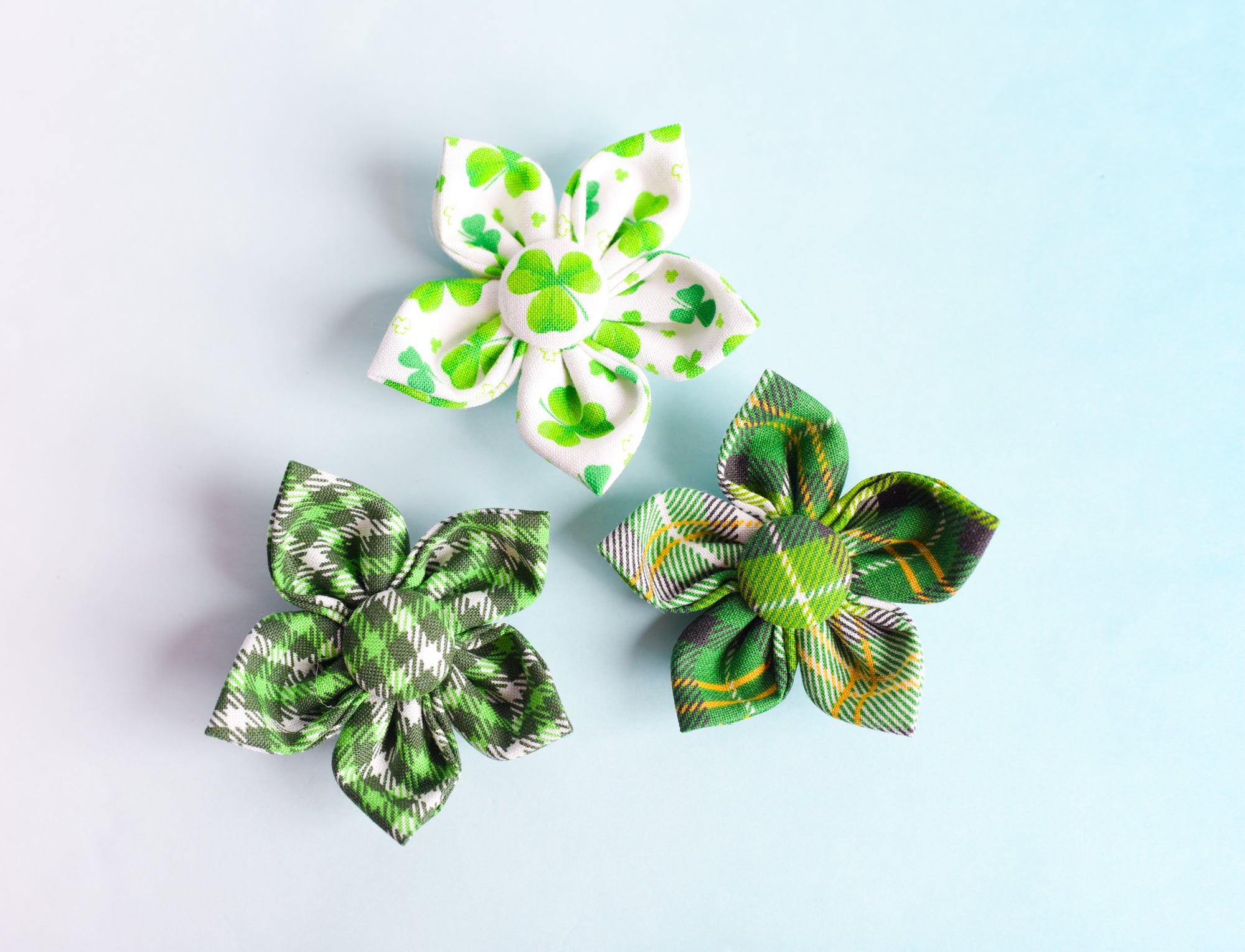 These sweet fabric flower magnets are handstitched from assorted green and white fabrics with handmade fabric covered button centers. Prints are perfect for St. Patrick's Day or anytime you want to show some Celtic Irish pride in plaid and shamrocks. The back is covered with felt and then a magnet is securely glued on. These would be perfect for your own refrigerator, or for a housewarming, hostess, or teacher gift idea! Fabric placement may vary due to the handmade process.