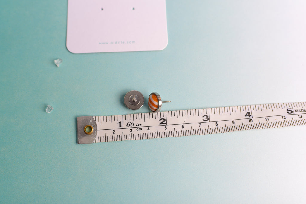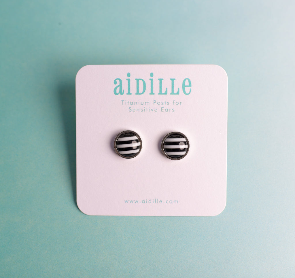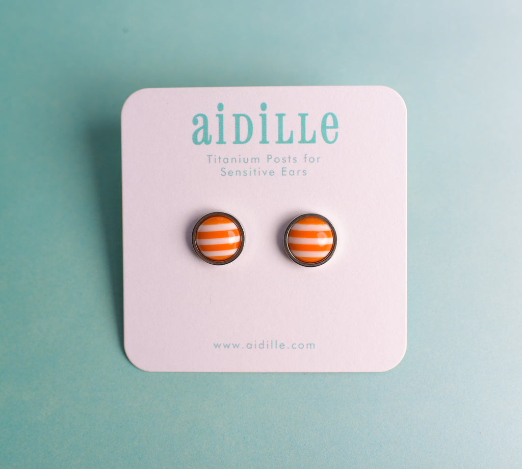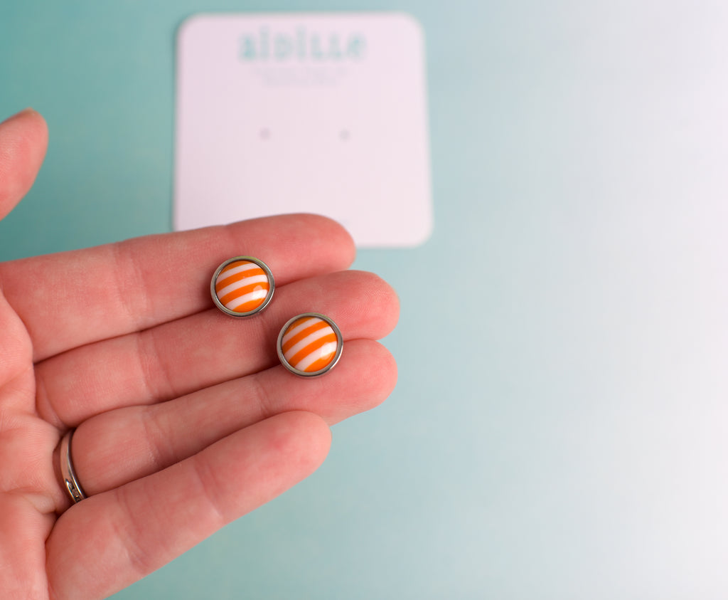Shiny domed striped resin earrings feature 10mm charms placed into slightly larger stainless steel bevel trays. Titanium posts are hypoallergenic and perfect for sensitive ears. Stainless steel butterfly and silicone nut backings are included for choice. Choose from 5 colors- very limited!