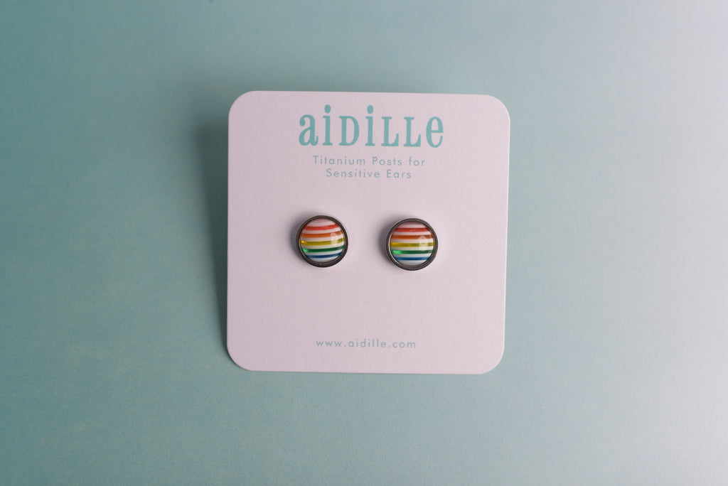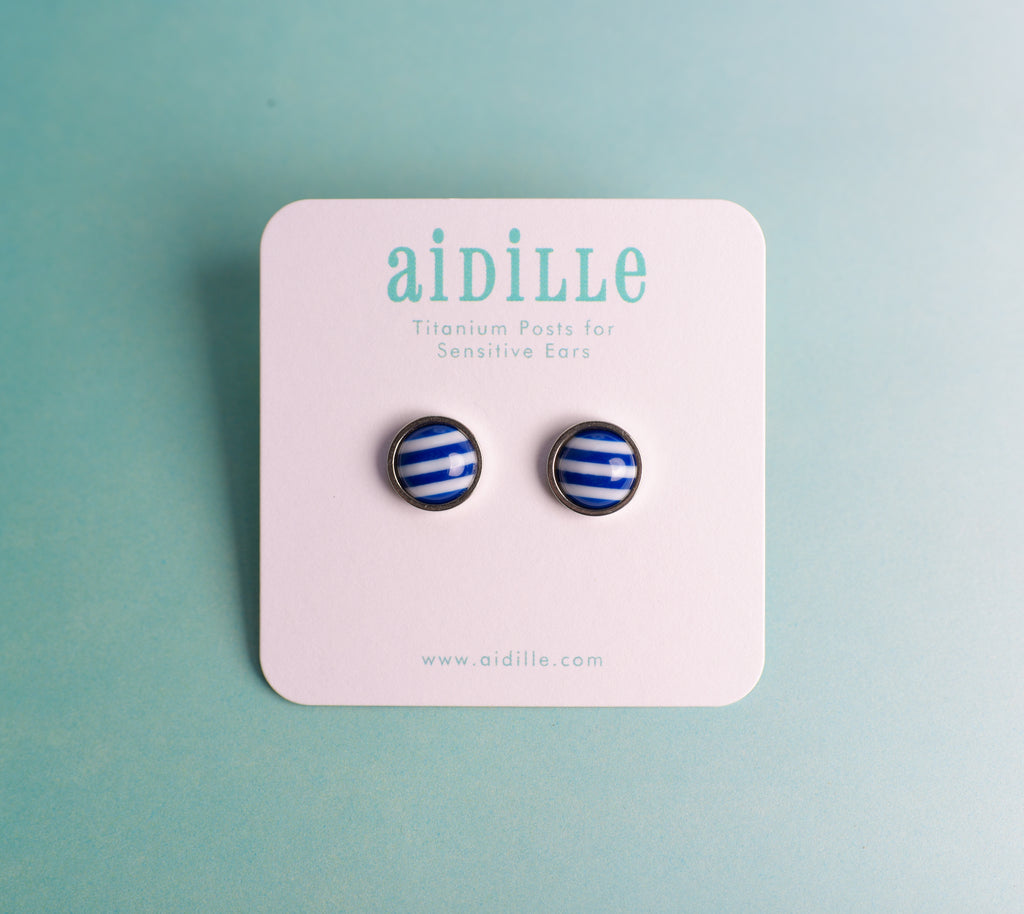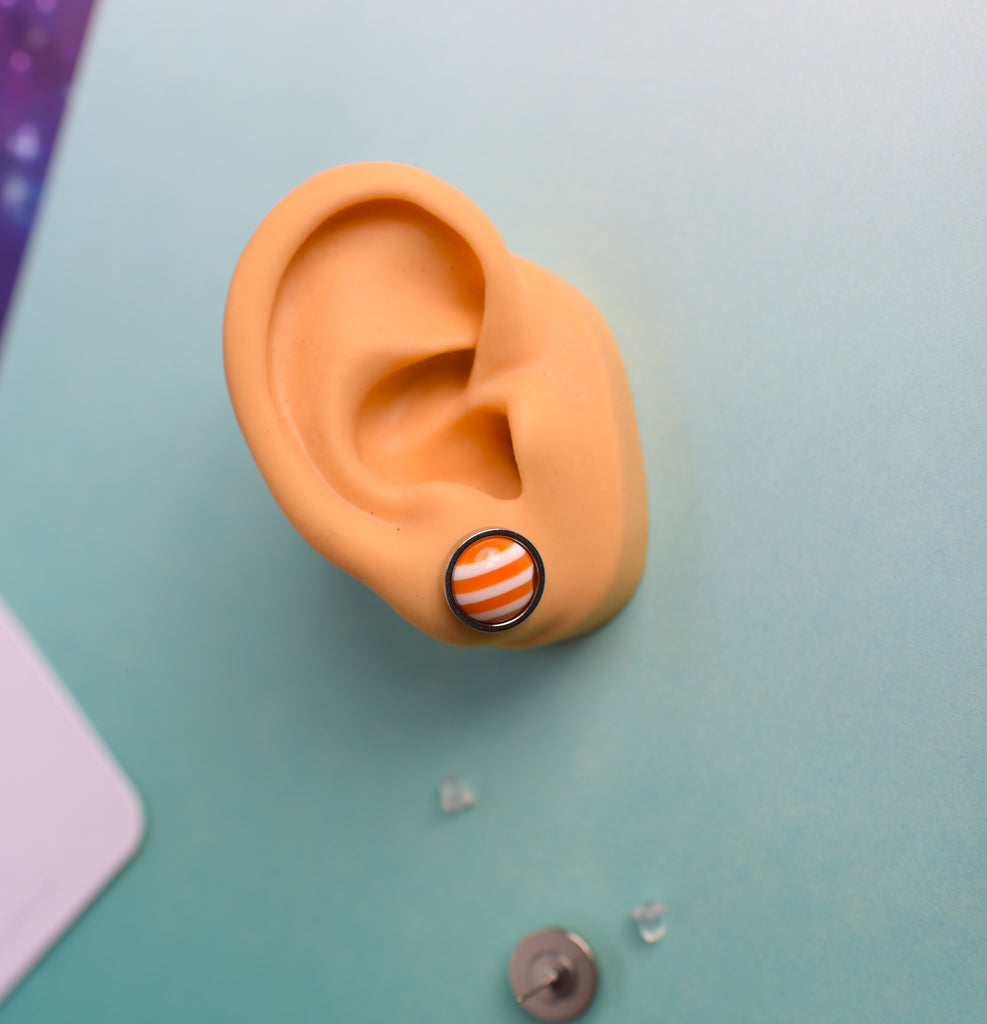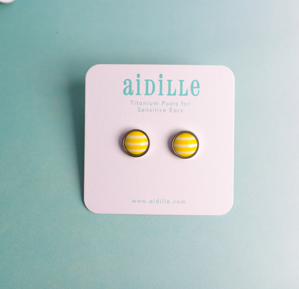 Shiny domed striped resin earrings feature 10mm charms placed into slightly larger stainless steel bevel trays. Titanium posts are hypoallergenic and perfect for sensitive ears. Stainless steel butterfly and silicone nut backings are included for choice. Choose from 5 colors- very limited!