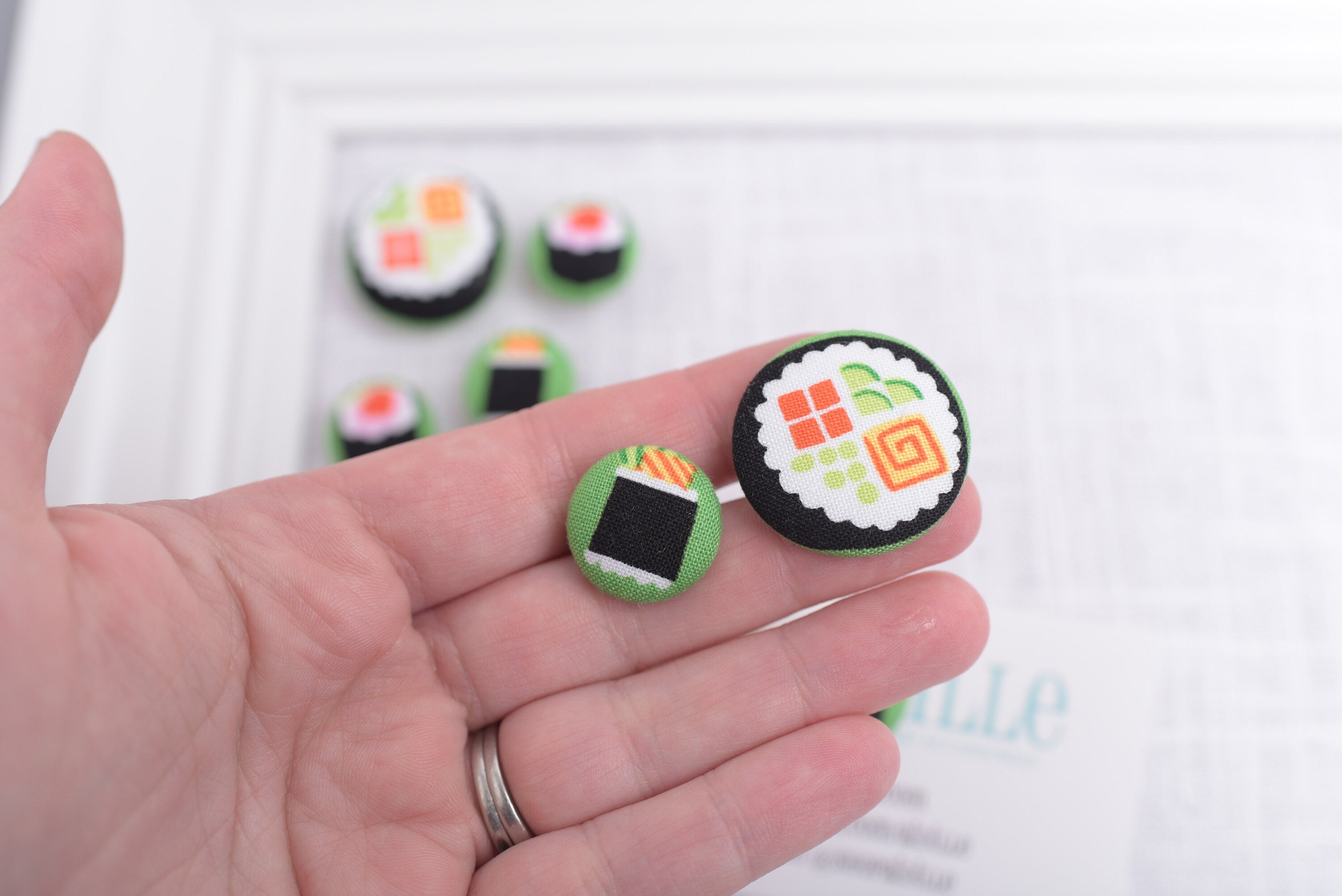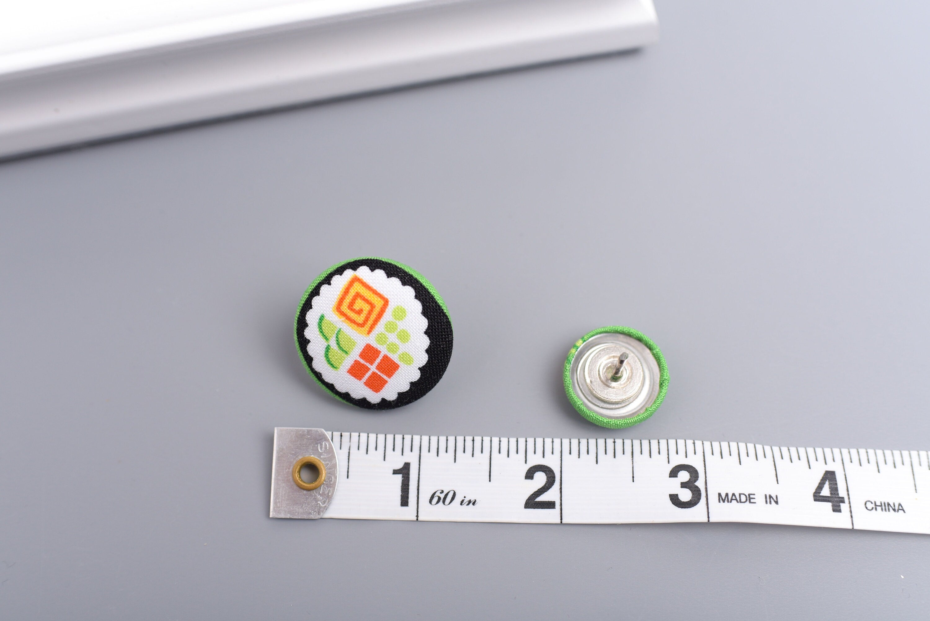 Handmade fabric buttons securely glued to thumb tacks