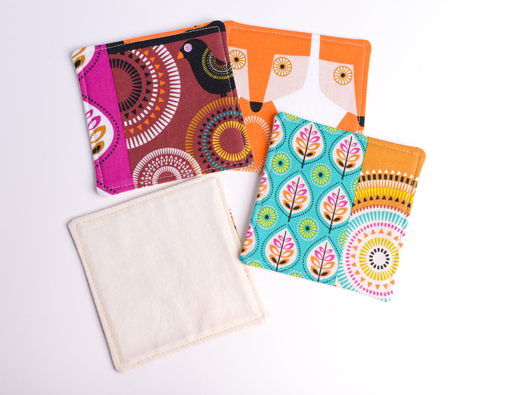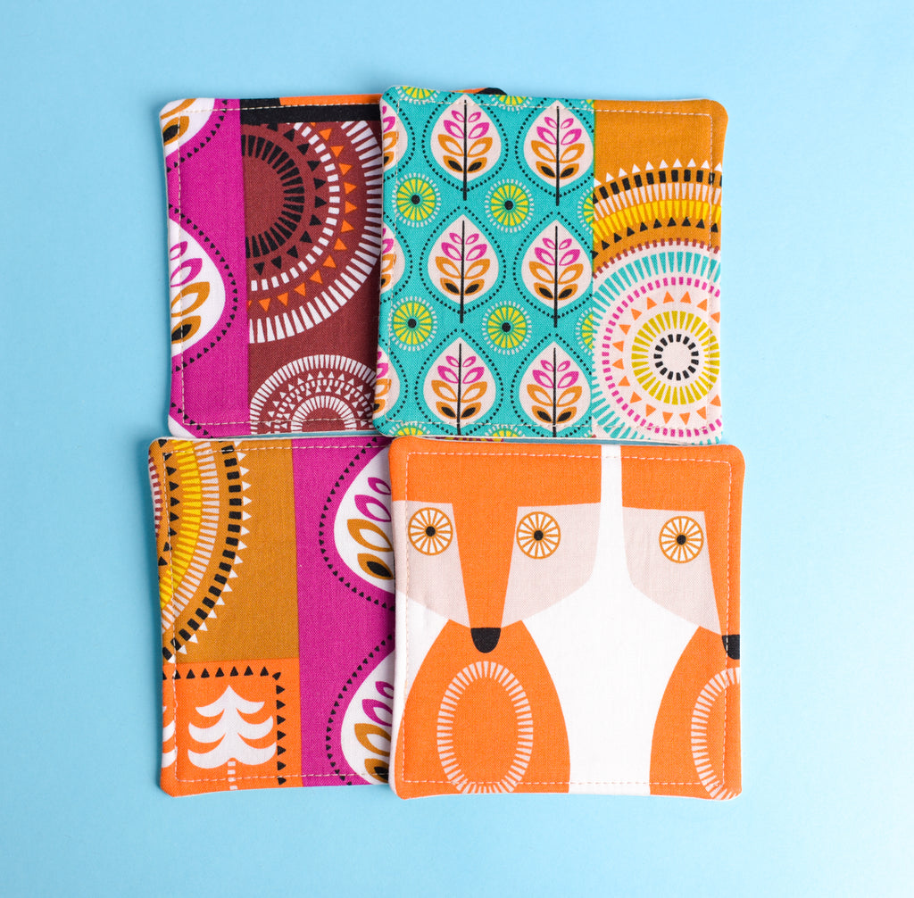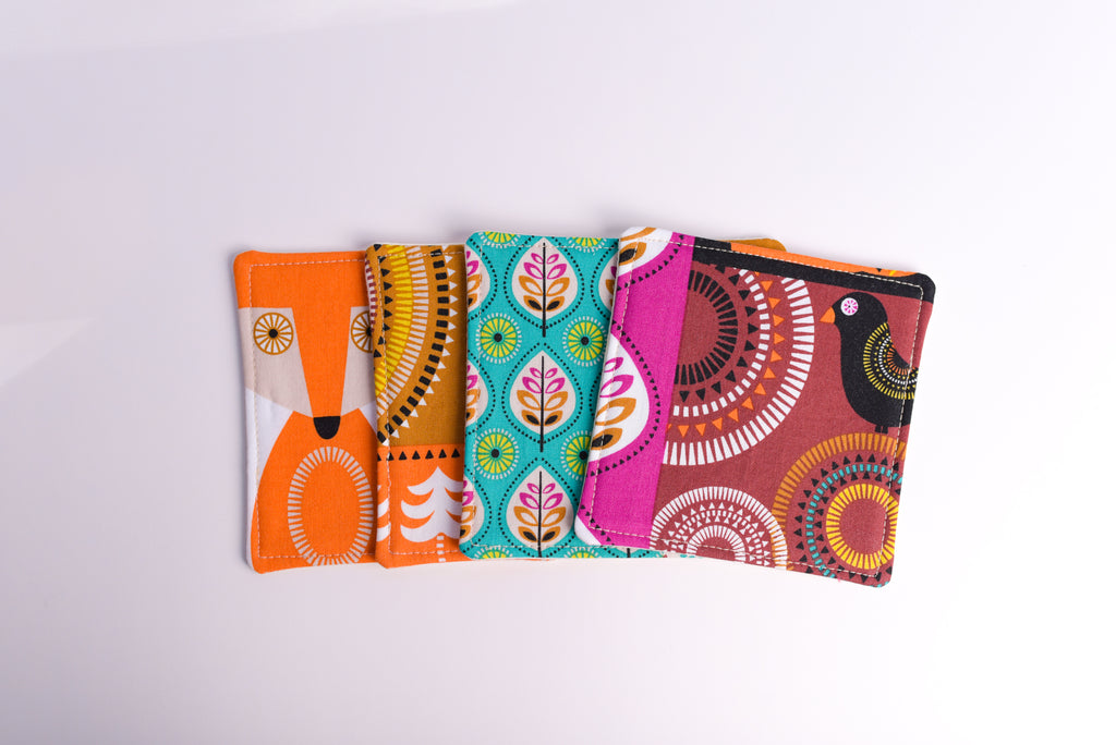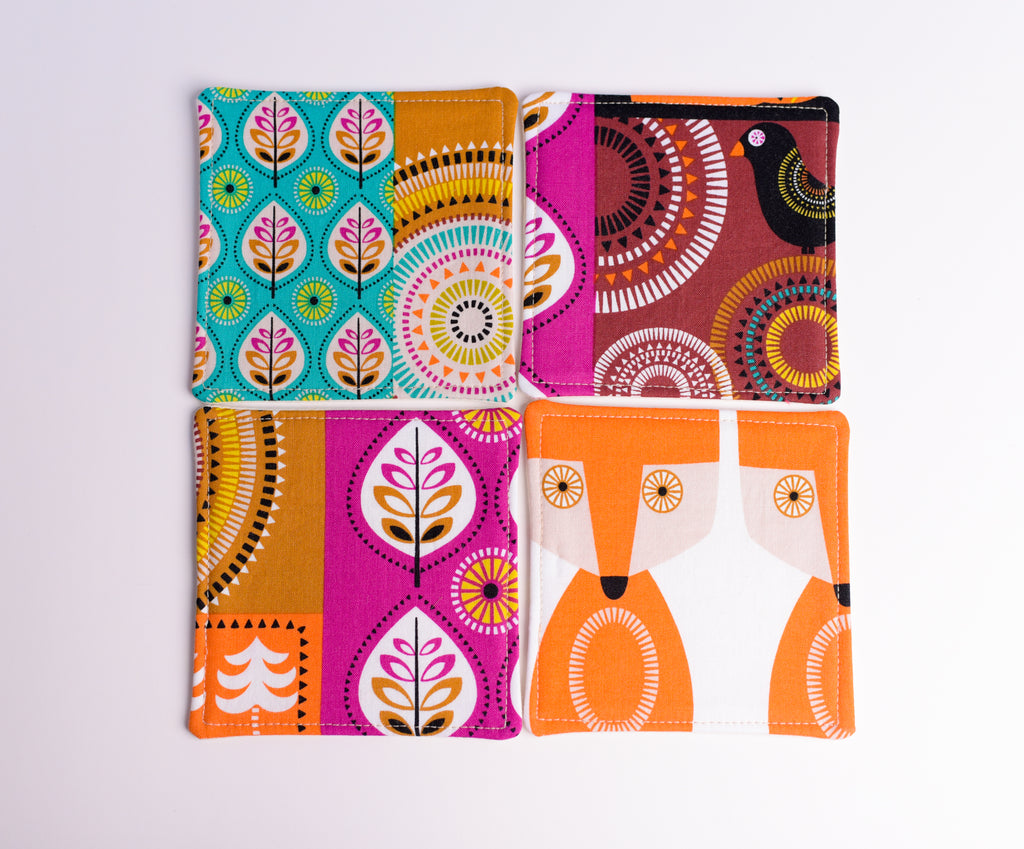 Colorful assorted woodland print handmade fabric coaster set; set includes 4 unique 100% cotton prints. Coasters are top stitched and have a beige fabric on the bottom and interfacing in the middle for absorbency. Fabric from the out of print Michael Miller Norwegian Woods collection. Only ONE set available!