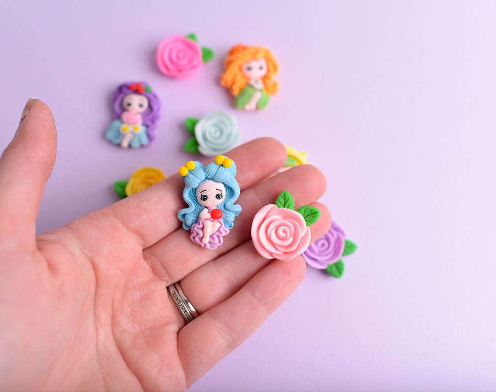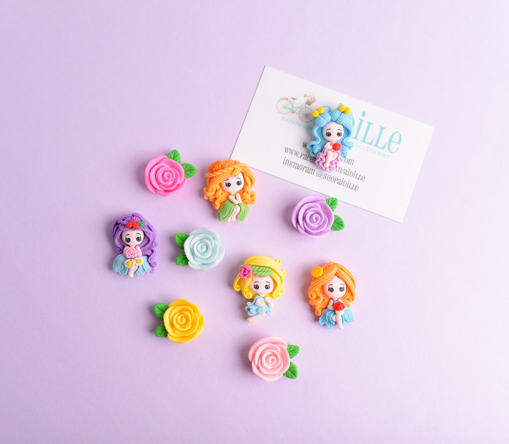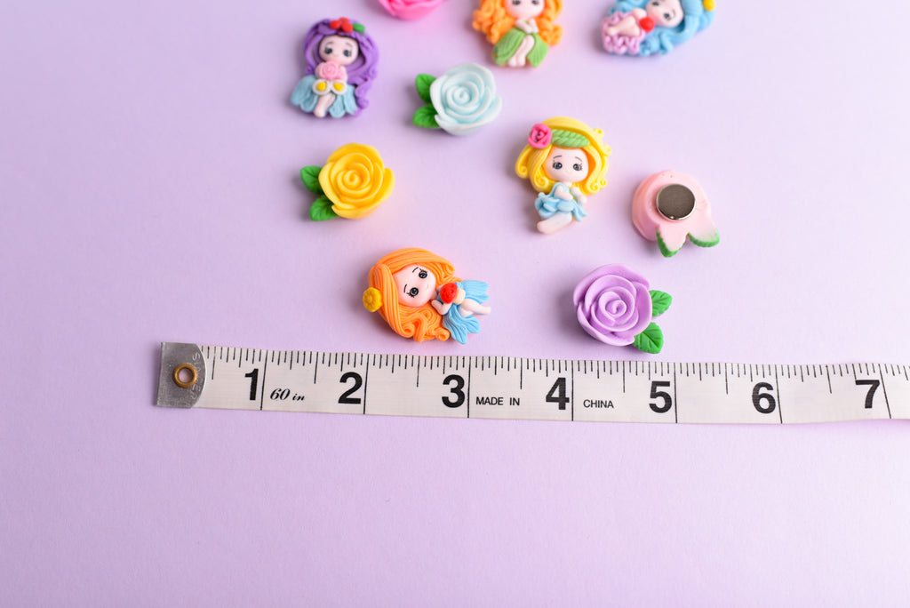 Set of 10 pretty woodland girl with resin rose magnets; perfect for girl's lockers or to add some whimsical flair to your cubicle or home refrigerator. Magnets are hand assembled using commercial charms and strong neodymium magnets. Girls measure around 1.25" long, roses about 1".